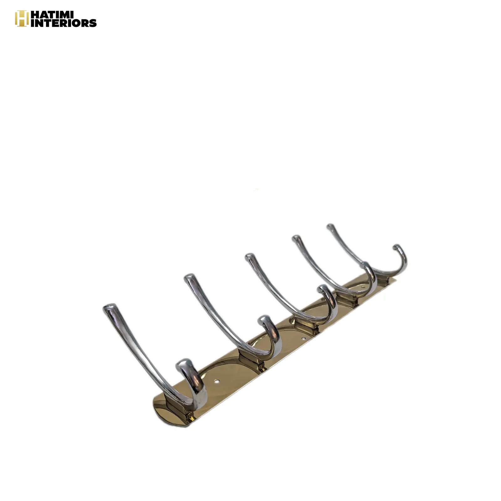 Elegant golden wall-mounted cloth hanger with 5 long hooks, made from high-quality non-magnetic metal. Durable, rust-resistant, and perfect for organizing clothes, bags, and accessories.