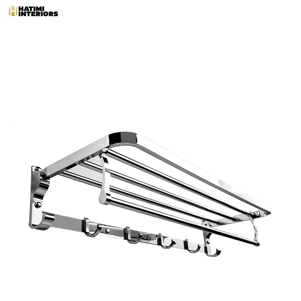 The Stainless Steel Bathroom Lavatory Foldable Towel Rack and Towel Shelf With Holder And Hooks is an elegant storage solution with a modern touch. Crafted from steel 304, its double towel rack and robe hooks provide all the space you need to store towels, clothing, and more. Sleek and sturdy, its contemporary design is sure to add a polished look to any room.