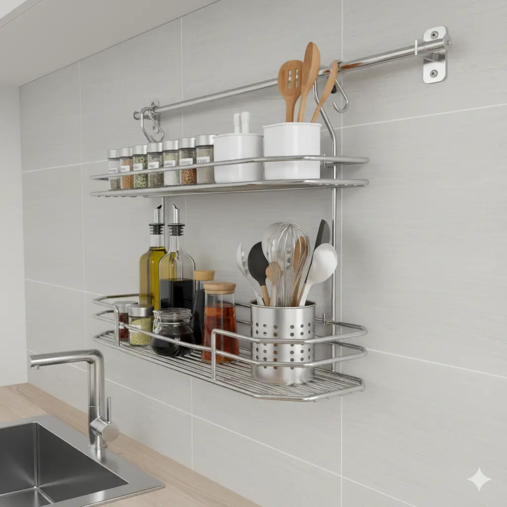 Keep your kitchen organized with the Hanging Double Rack, designed with a sleek chrome finish and a two-tier structure for maximum storage. Ideal for storing spices, herbs, and utensils, this kitchen storage hanging rack also works as a bathroom hanging rack, garden tools hanging rack, or wall hanging rack for shops. Perfect for kitchens, apartments, and modern homes in Pakistan.