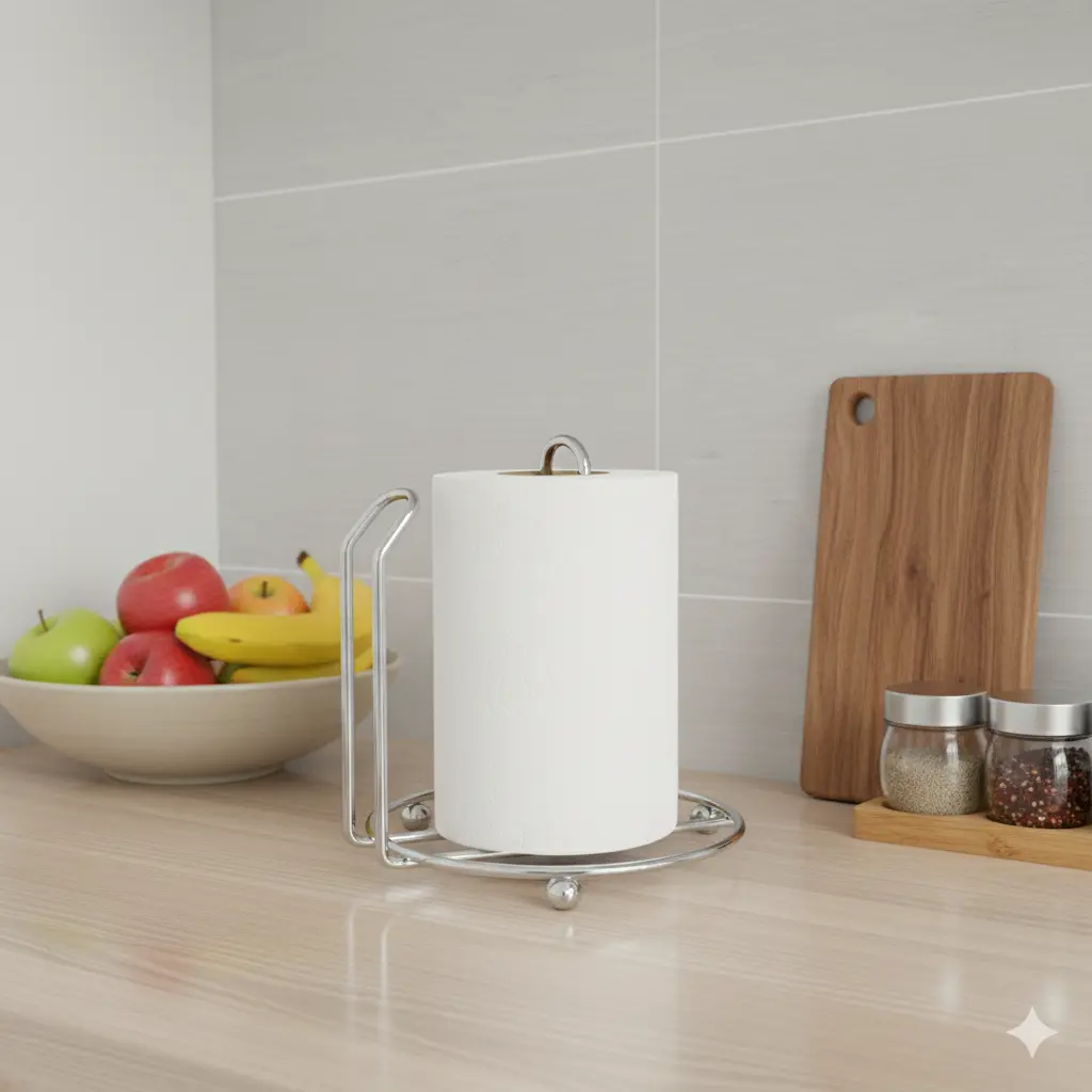 Elevate your kitchen or bathroom organization with the Tissue Holder. Crafted from durable chrome-plated metal with a weighted base, it keeps your tissue rolls secure, stylish, and always within reach.