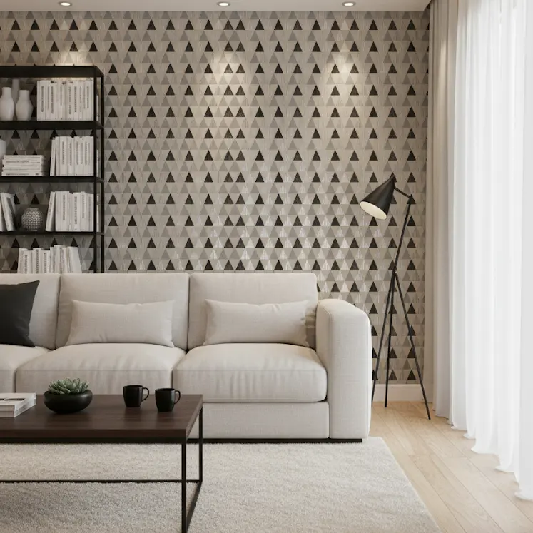 Transform your walls with our Geometric Triangle Wallpaper, featuring a modern black, gray, beige, and white pattern. Its stylish design adds rhythm and movement—perfect for living rooms, bedrooms, offices, and cafes.