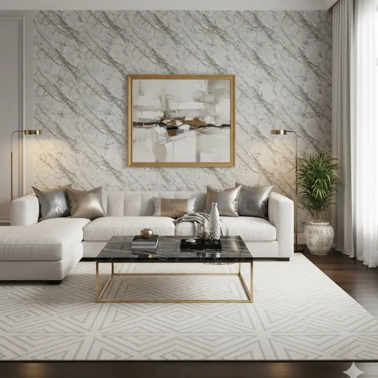 Add refined elegance to your space with our Linear Geometric Wallpaper, featuring chevron-inspired patterns in gray, black, and white with golden accents. Perfect for modern homes, offices, and boutique interiors.