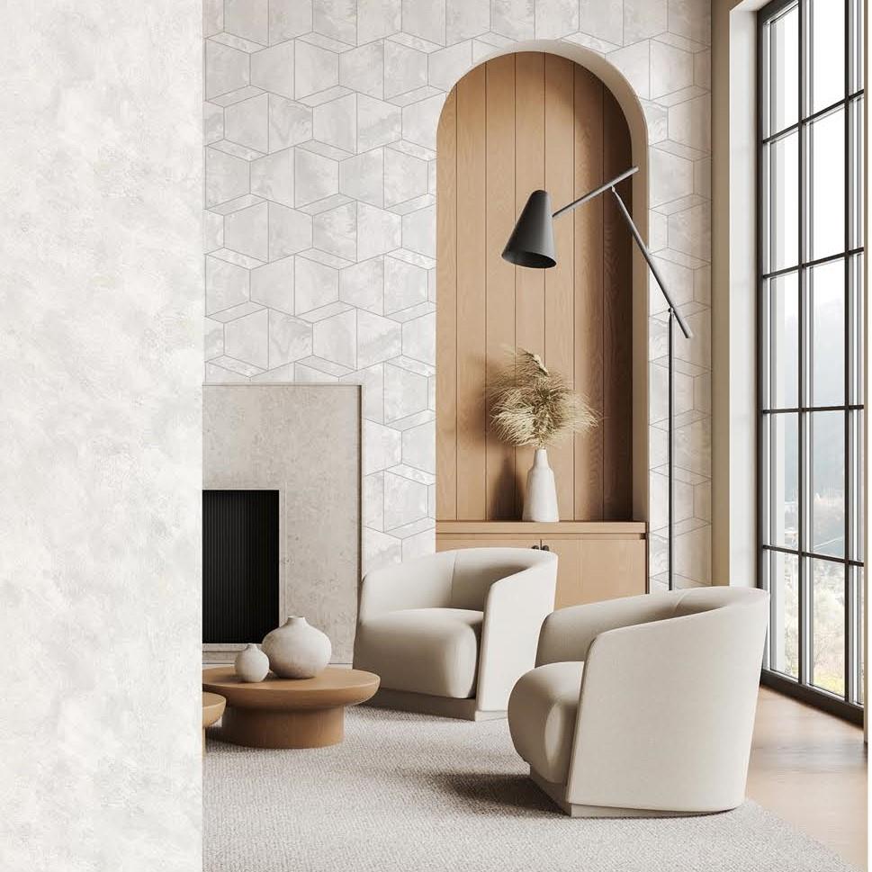 A fusion of geometric precision and natural texture, this wallpaper design brings a striking depth to any space. The structured hexagonal patterns create an optical illusion of depth and layering, adding a modern yet timeless aesthetic to interiors. Ideal for contemporary settings, it blends architectural elegance with refined simplicity.